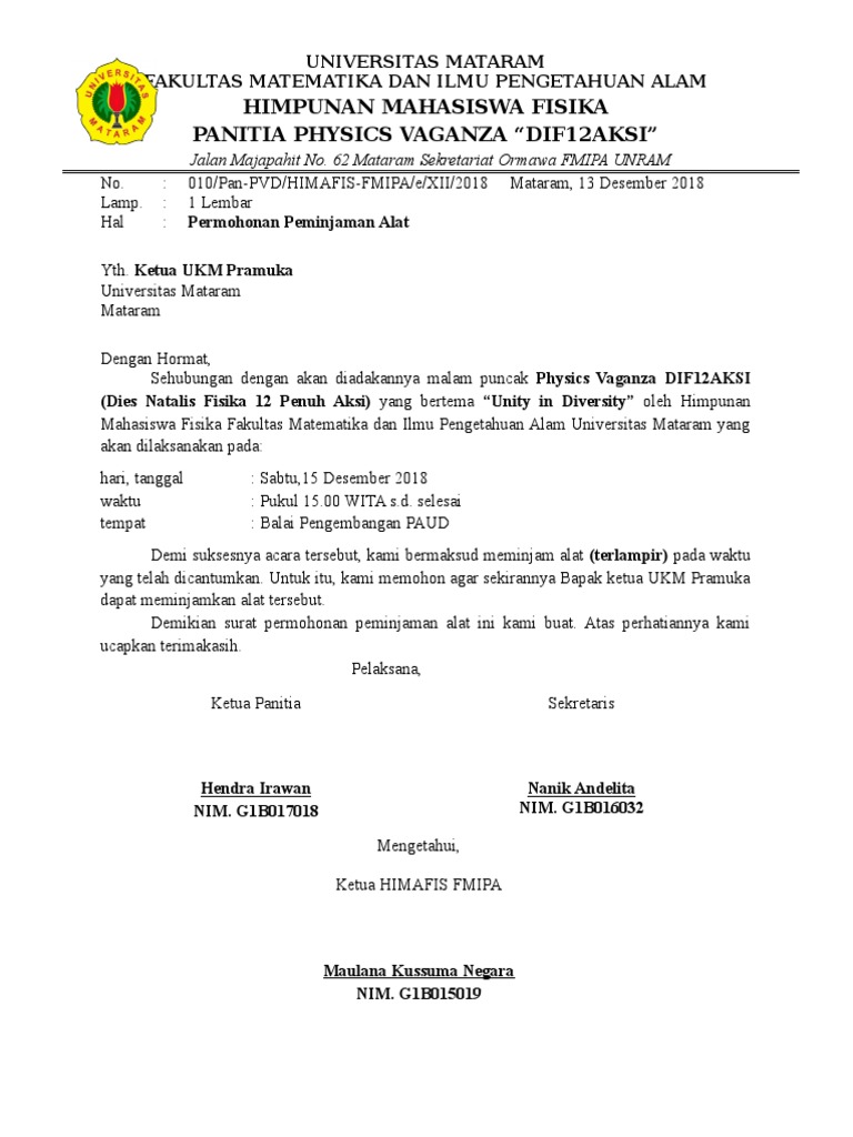 Surat peminjaman barang ialah surat yang di pergunakan untuk meminja suatu barang, umumnya mencakup jumlah dari berapa barang atau alat yang akan dipinjam serta oleh siapa barang dipinjam dan tertera kesepakatan sampai kapan barang dipinjam dan kapan dikembalikan. Contoh surat peminjaman barang kegiatan gerakan pramuka. Kepala program studi d.iii hiperkes dan kk di tempat dengan hormat, sehubungan akan diadakannya kegiatan kominfo fest 2014 lomba video k3, yang akan diadakan pada. Dan postingan kali ini menyajikan surat permohonan peminjaman alat untuk universitas yang bersangkutan. Adapun kegiatan ini rencananya akan dilaksanakan pada